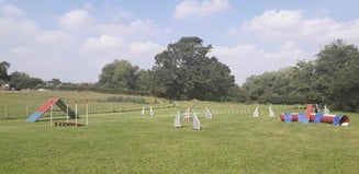 Here is our fully enclosed paddock, set in the picturesque village of Worthington, overlooking wide open fields. We have a full course of agility equipment, including full size A-Frame, dog walk, see-saw, weaves, jumps and tyres.